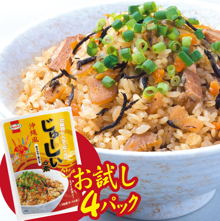 「じゅーしぃの素」は沖縄風炊き込みご飯が作れるレトルト食品で、豚肉や人参、ごぼう、しいたけ、昆布、ひじきといった具材がたっぷりと入っている。沖縄ホーメル独自の味付けで、しっとりとおいしいじゅーしぃが作れるのだとか。